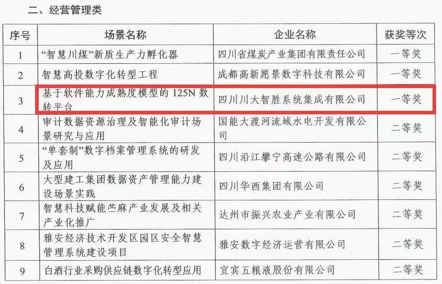 此外,川投數(shù)科(原簡稱:智勝集成)服務(wù)“智改數(shù)轉(zhuǎn)”的熱度正不斷升溫。日前,川投數(shù)科(原簡稱:智勝集成)基于軟件能力成熟度模型集成(CMMI)打造的125N(1平臺、2中心、5應(yīng)用、N場景)數(shù)轉(zhuǎn)平臺獲四川省國資國企數(shù)字化轉(zhuǎn)型優(yōu)秀場景評選一等獎。