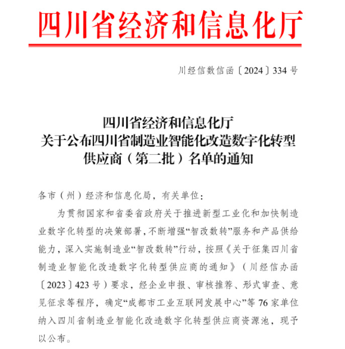 2024年6月17日,四川省經(jīng)濟和信息化廳公布了《四川省制造業(yè)智能化改造數(shù)字化轉型供應商(第二批)名單》,川投信產(chǎn)所屬川投數(shù)科(全稱:四川川投智勝數(shù)字科技有限公司,原全稱:四川川大智勝系統(tǒng)集成有限公司)(以下簡稱“川投數(shù)科(原簡稱:智勝集成)”)成功入圍“系統(tǒng)集成服務商”資源池。